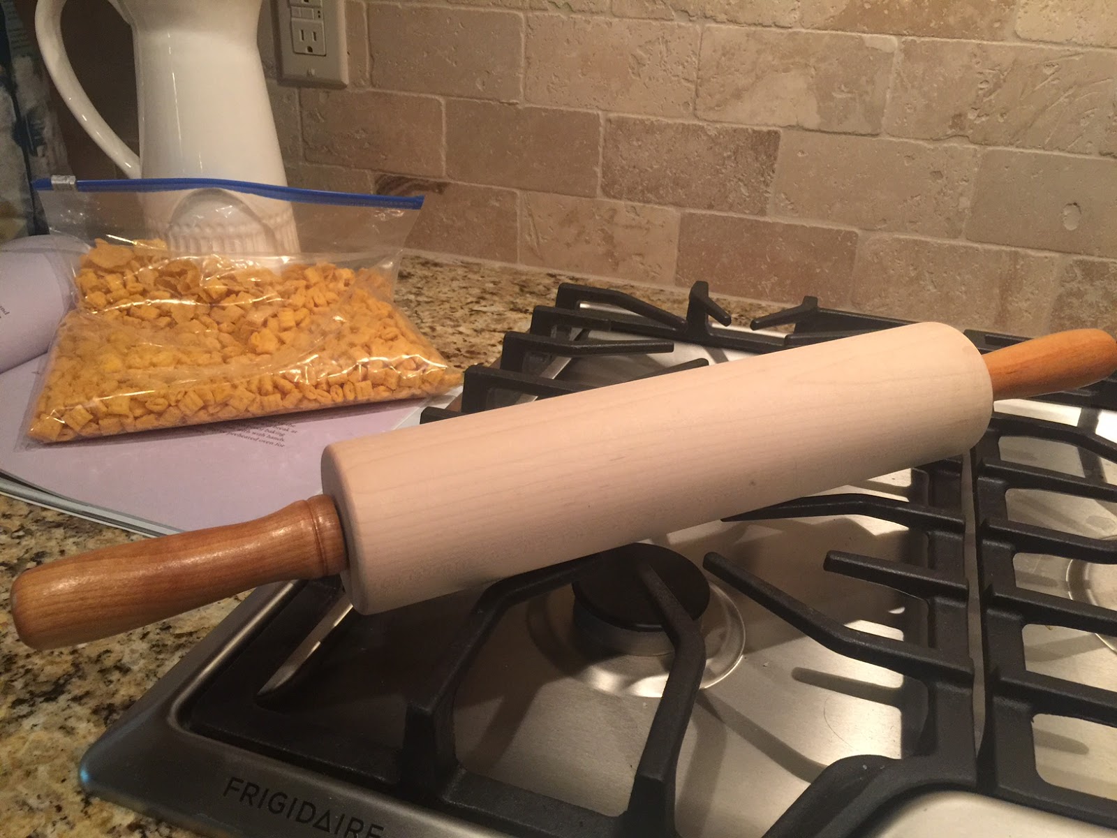 Put 2 cups of Captain Crunch and 1 and a half cup of corn flakes in a gallon size Ziplock bag. Beat the crazy out of the two cereals. I used a rolling pin; this is an incredible way to get out some aggression!