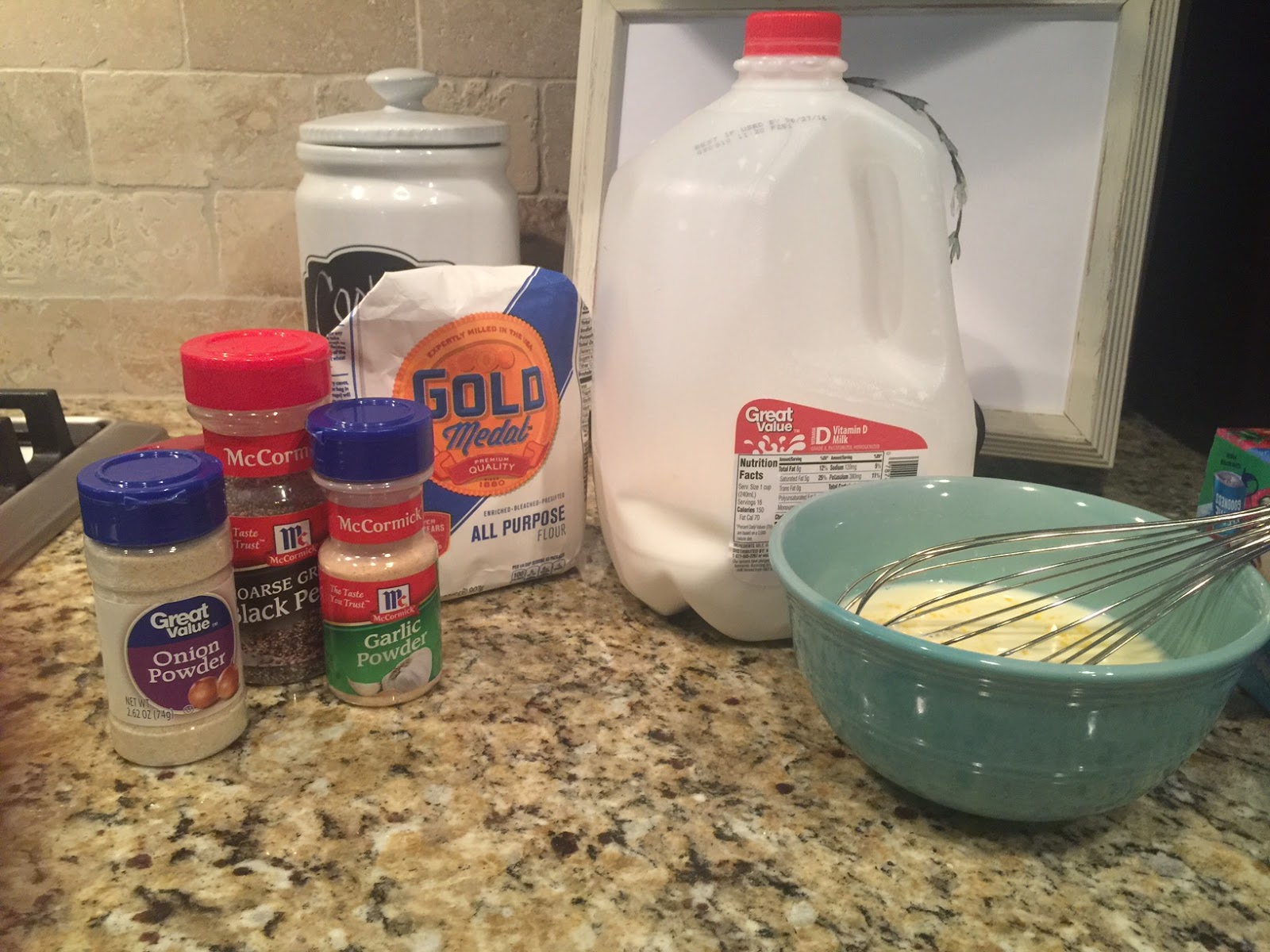Mix together the following: 1 cup of flour, 1 tsp of garlic powder, 1 tsp of onion powder, and 1/2 tsp of black pepper.