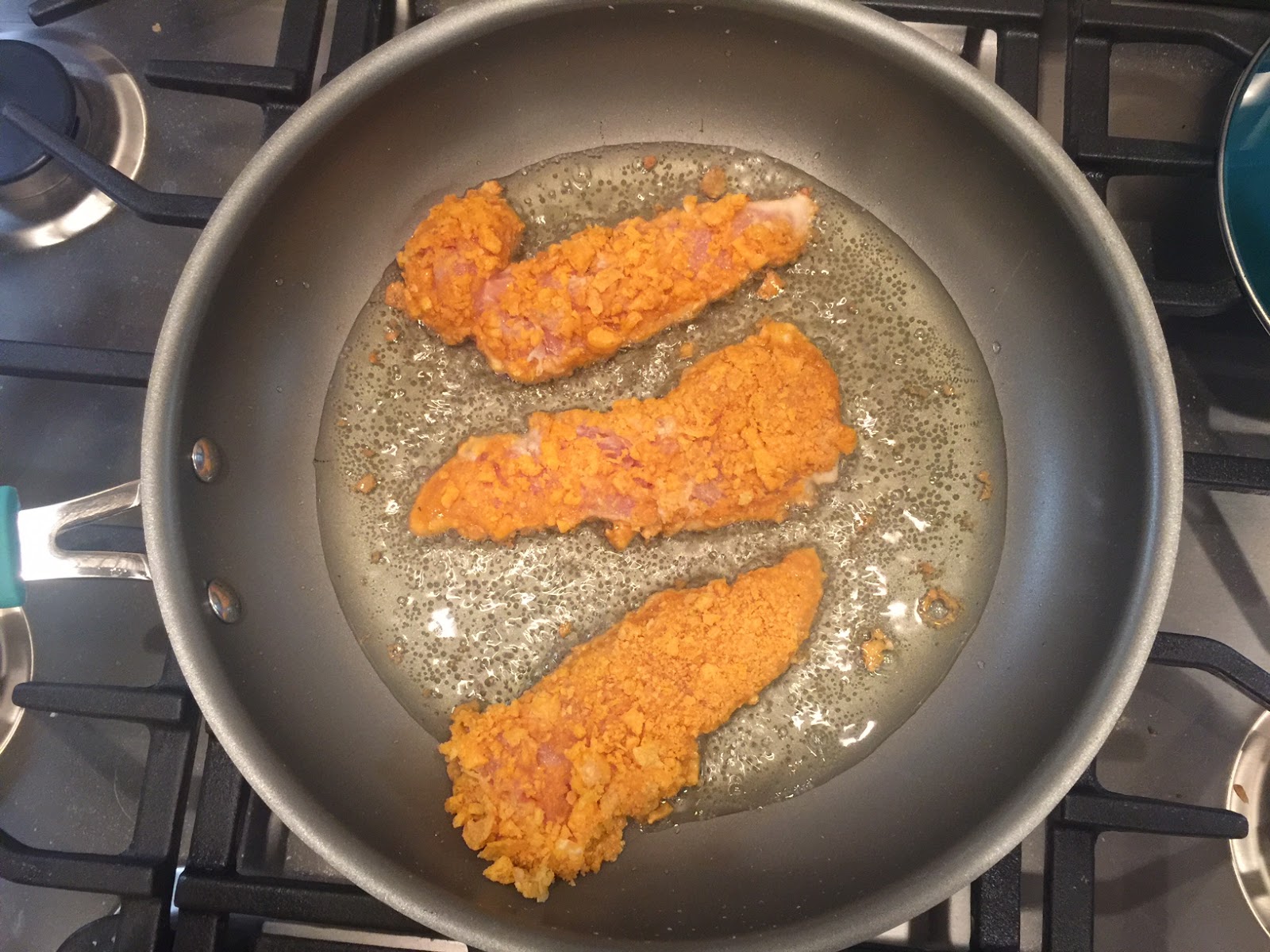 In a large skillet, pour a layer of oil (I used vegetable oil) and bring to a simmer. Drop coated chicken into the hot oil and fry until done and no longer pink in the middle. About 3-5 minutes depending on the size of the chicken pieces.