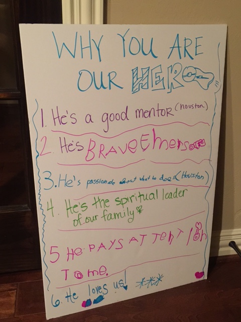 Wouldn’t you know it that our kids were the ones that spurred on the best of him in a swift 5 minutes. When we got together to talk about his attributes, their heart about spilled on the table. I added a whole two items to the list (because I wanted to get something in!), but the ideas from their deep love for him were so heartfelt, yet said with such fluidity, that it actually caught me off guard.