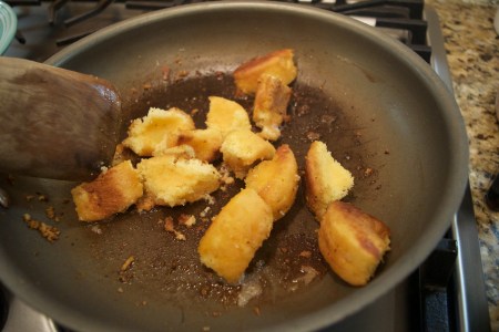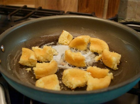 And here’s the kicker; you want your cakes NOT to fall or crumble off the skewer. Therefore, you need to crisp them up a little bit. Heat your skillet to low and melt about 2 tbsp. of butter. Place the cakes in the skillet and let them cook just a little; not too much or they will burn. You want them just crisp enough (kind of like a funnel cake), but not burned. Watch them and turn them carefully. If you need to add more butter, go ahead! Don’t be skeered! The more the merrier in this situation.