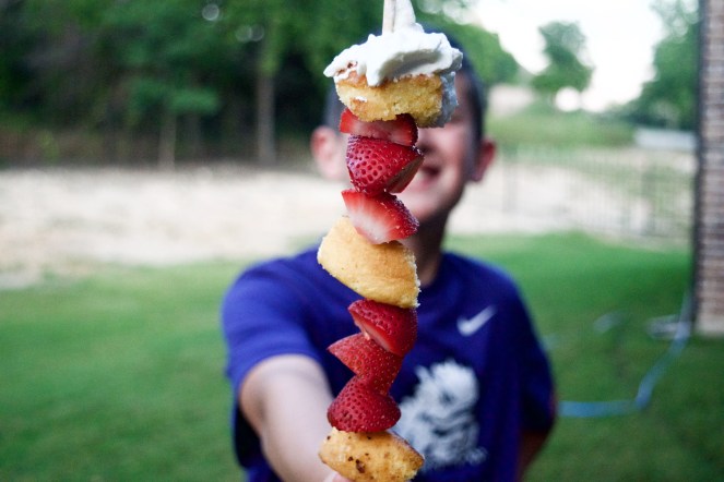 And while we’re at it, let’s go ahead and add some summer food into these days, shall we? When I think of summer foods, my mind immediately goes to grilling, s’mores, fresh fruit, and KABOBS! I have tried several chicken and steak kabobs this summer so far that are delish (I’ll share more of those later), but I think I might have found just the right DESSERT kabob to add to your summer nights…
