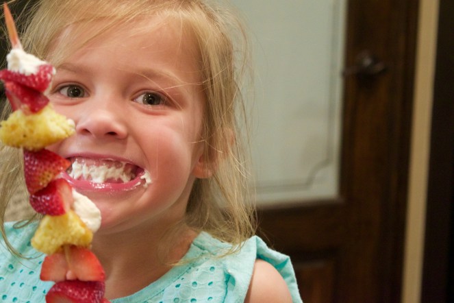 We aren’t done quite yet! We absolutely have to add that scrumptious whipped cream. My kiddos wanted to have all the whipped cream on the top (of course!), and I added whipped cream to the others on the sides. Have you seen those naked cakes that are the rage right now? The ones with the icing just lightly spread across the cake? Think the same thing with the whipped cream. The kabobs will look gorgeous and will be ready to consume!