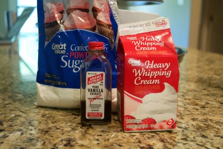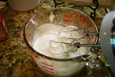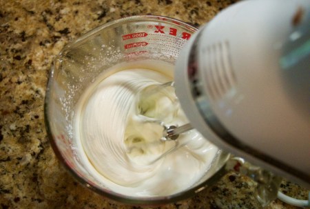 Before making the whipped cream, put your beaters from a hand mixer in the freezer, along with a small bowl to mix the ingredients, and the heavy cream. Keep in the freezer for at least 15 minutes. Trust me. You want to do this.