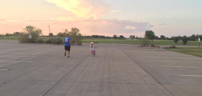 Our little firecracker of a daughter decided one night that she wanted to ride her bike. This one is a determined little girl, I tell ya’. Once she makes up her mind, it is quite hard to stop her. This can be great or horrible…depending on the circumstance! Parents of strong willed children, you know what I’m talking about!